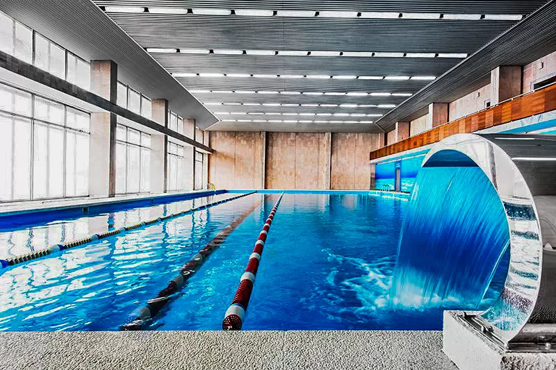 - Большой бассейн с аквакомплексом. Здесь есть зона для детей и гидромассажный душ. В бассейне можно будет как плавать, так и заниматься лечебной физкультурой